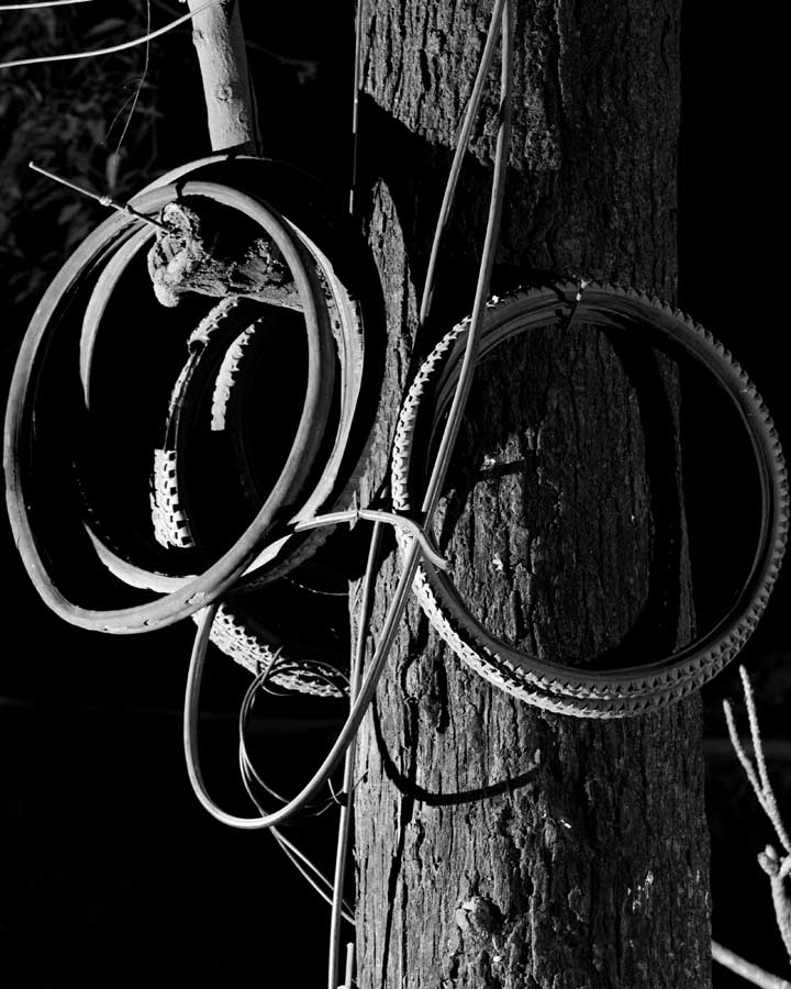 Sounak_Wire Formation_01- Coil of wires and tires in the tree trunk, the modern city offers no place for the rickshaw mechanic.