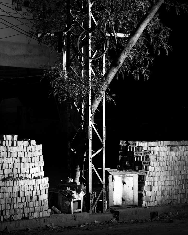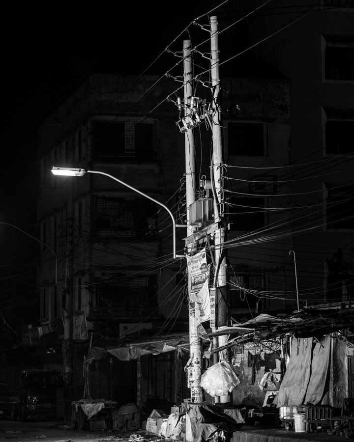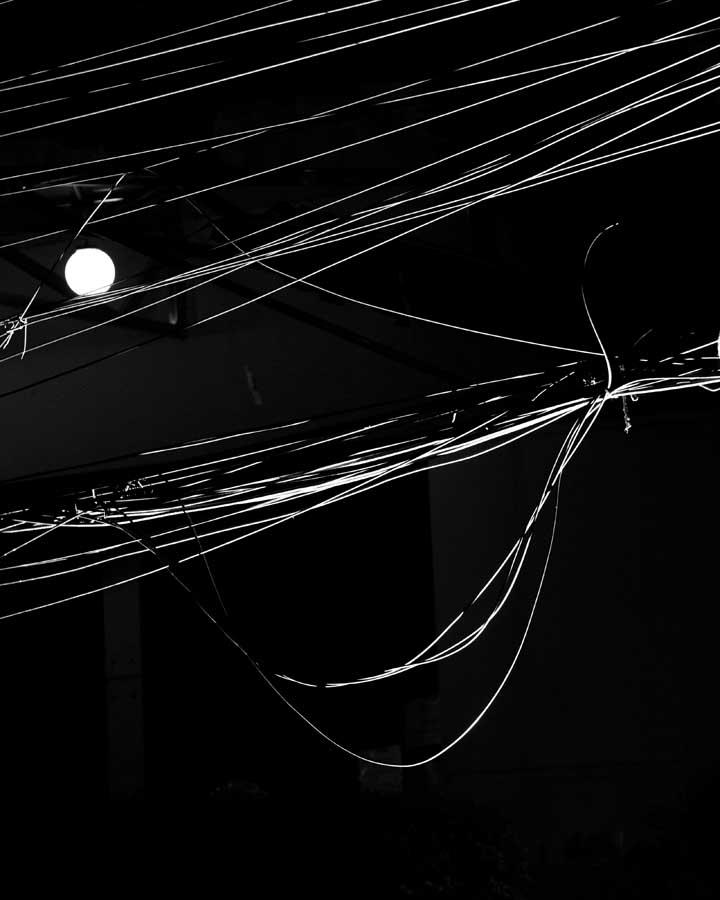 Sounak_Wire Formation_02- The formations of wires winks, with a lamp on a building.