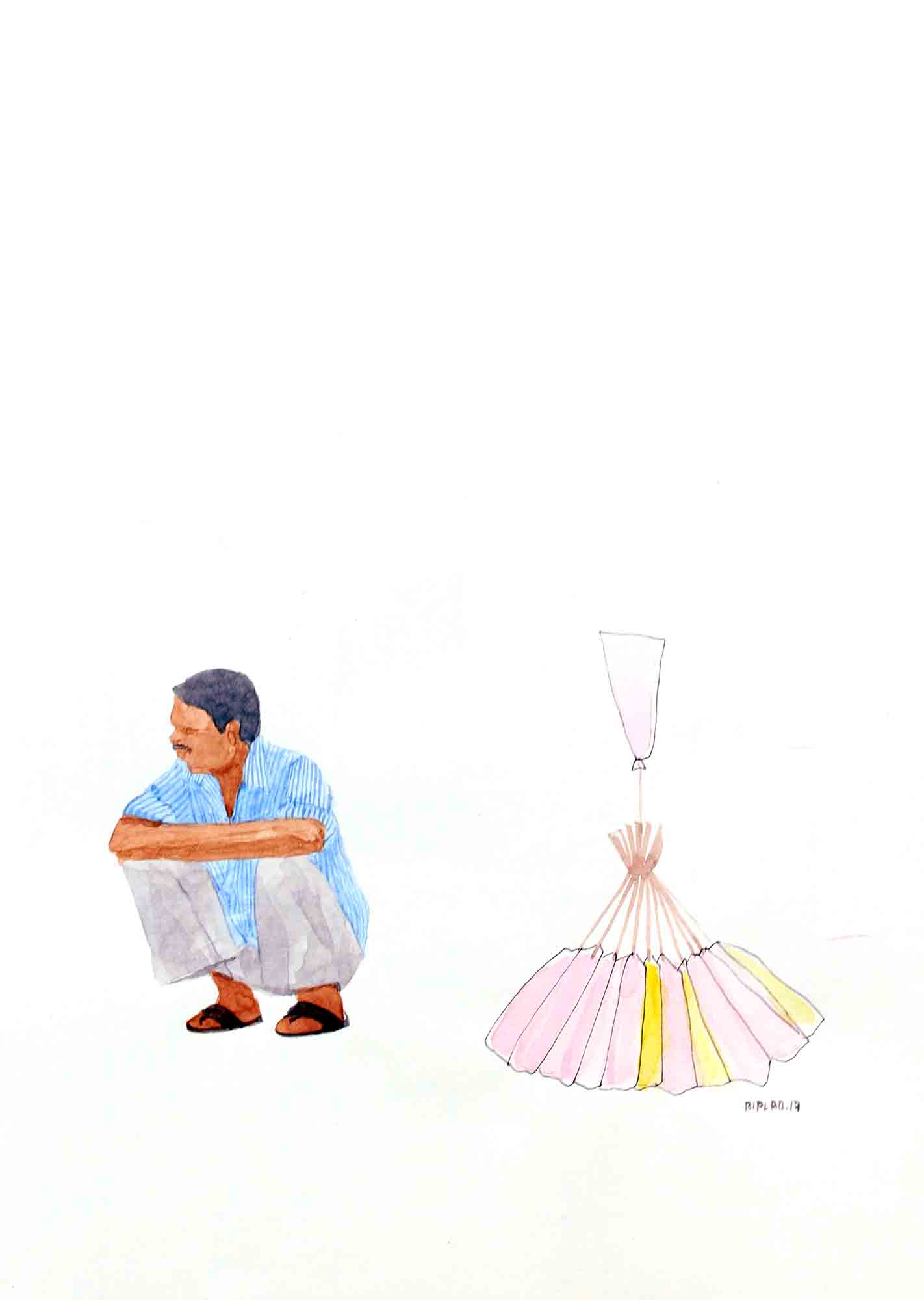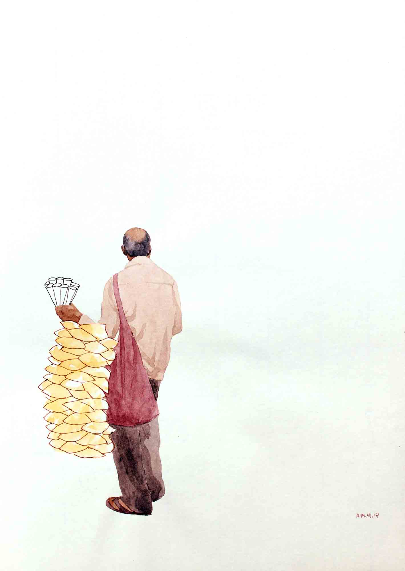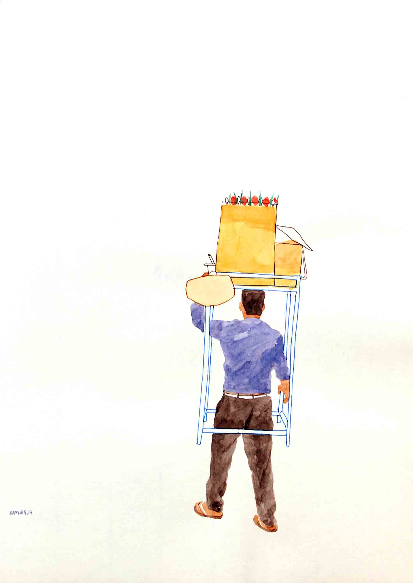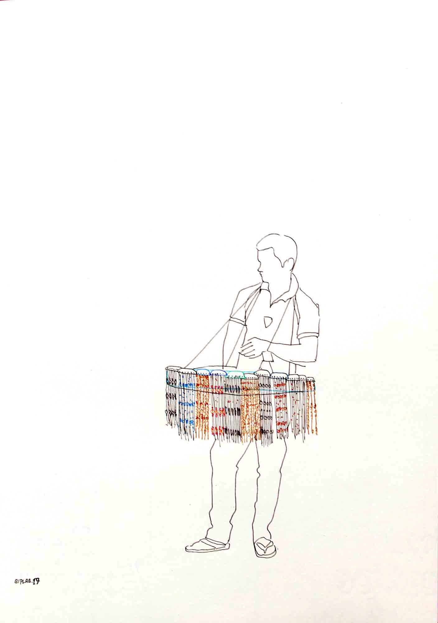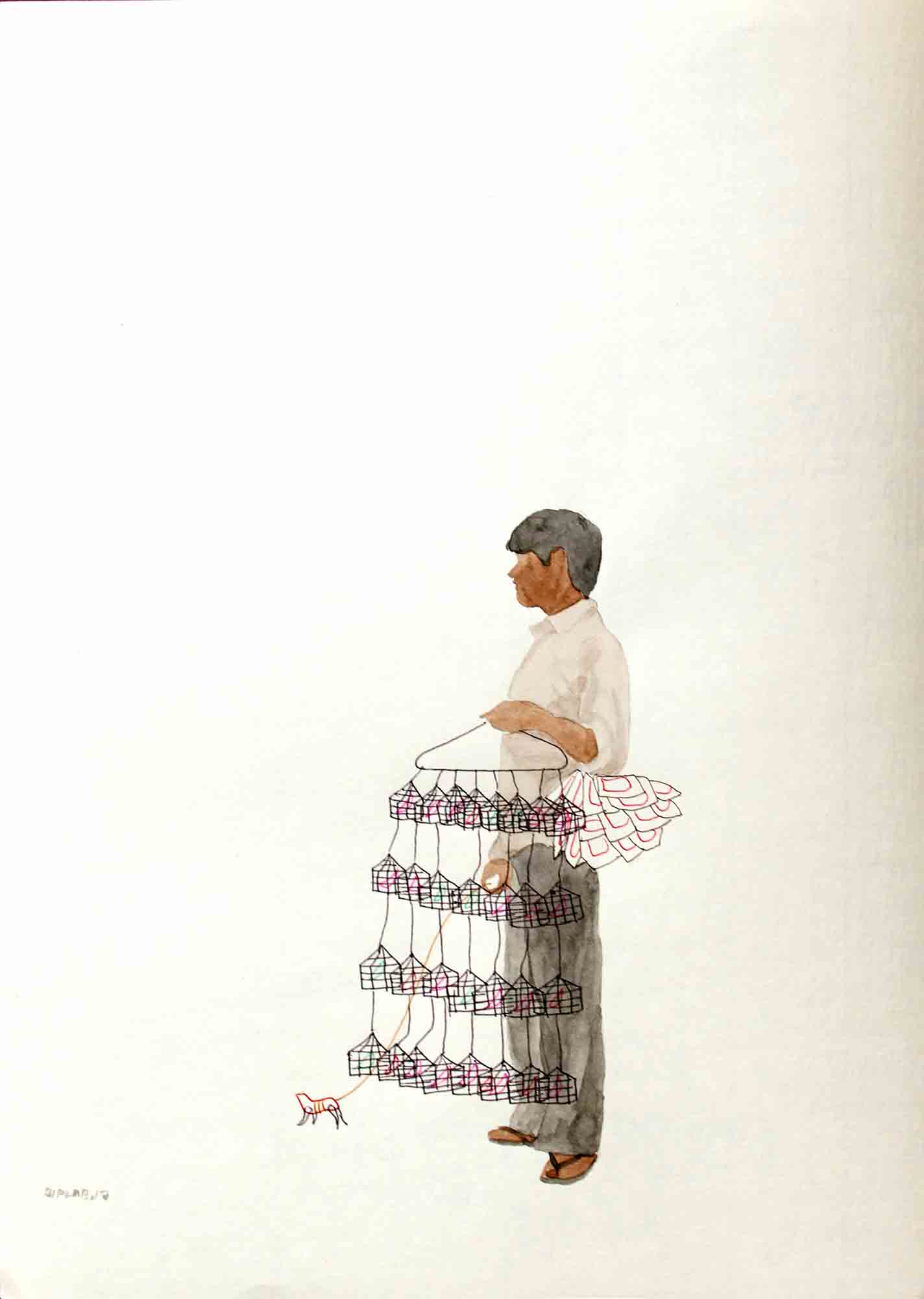 Sarkar's body of work narrates his extensive research on lifestyle and struggles of hawkers in their everyday life, and explores the relationship of body and object in an urban context. The miniaturist approach in his work underlines the simplicity and yet intricacy in his theme. The India Gate Series, in a simplistic form, portray the lifestyle of hawkers working at the India Gate. Sarkar is moved by the attitude of these hawkers who in spite of their difficult living, deal with their customers with great enthusiasm.
