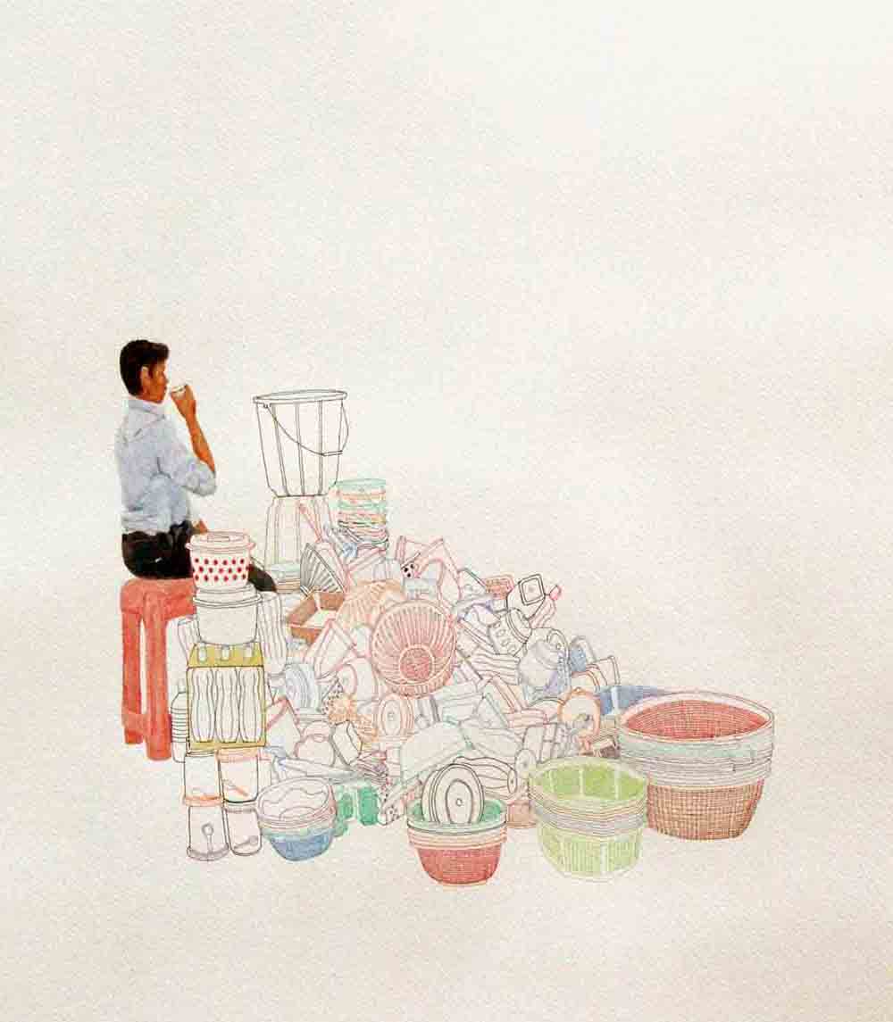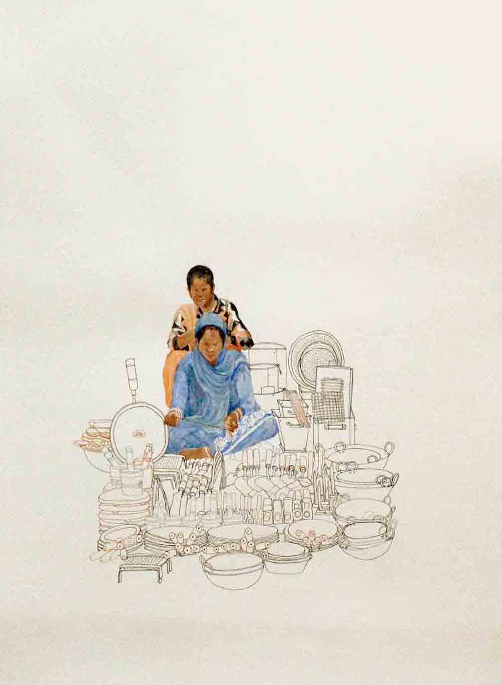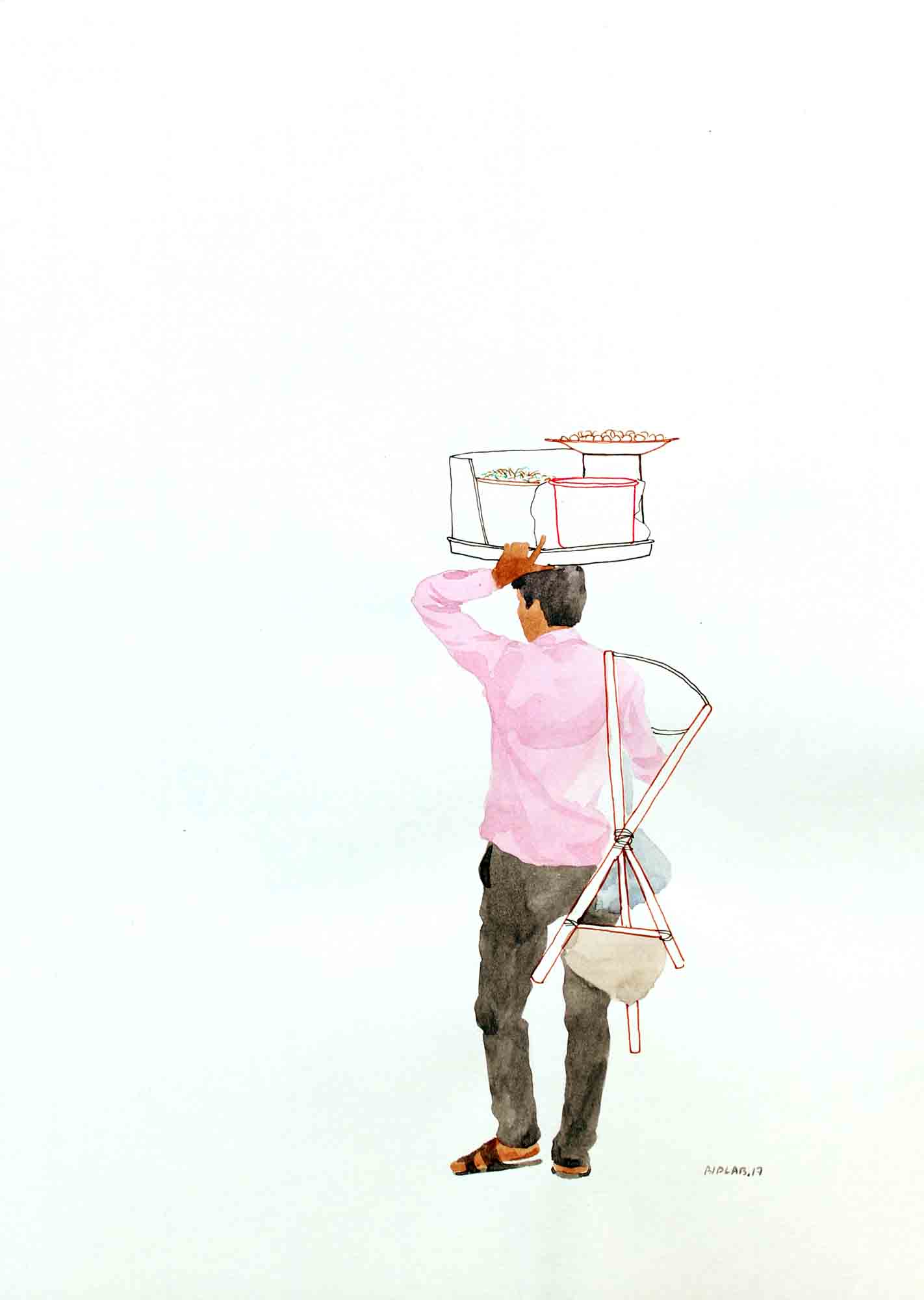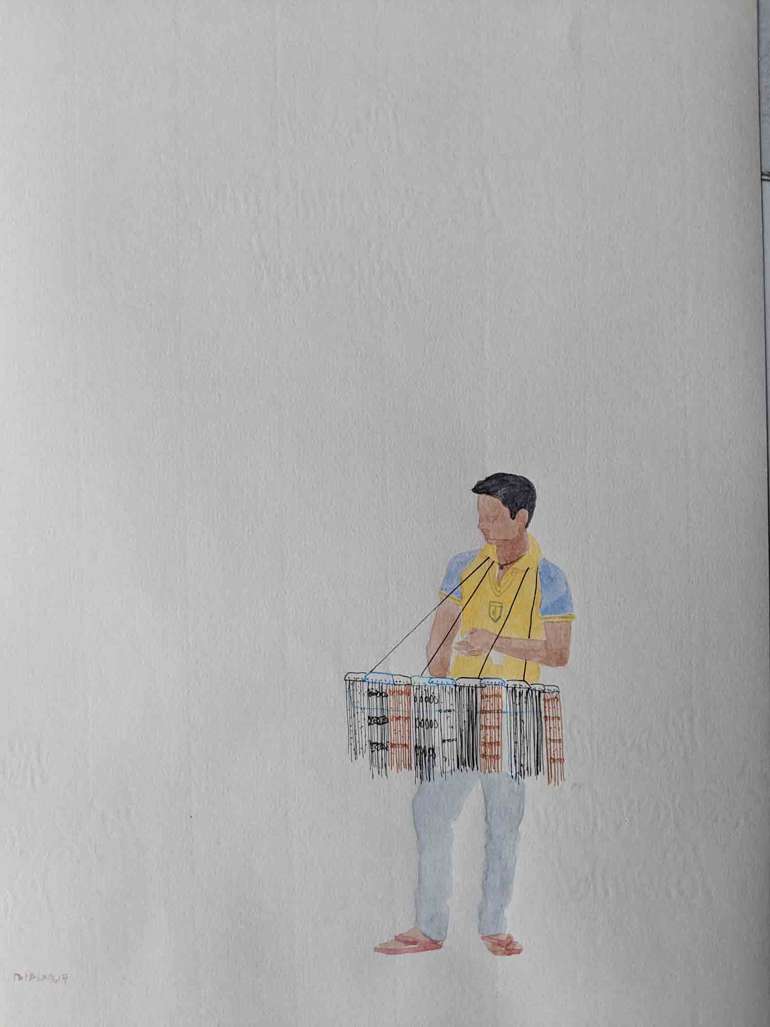 Sarkar's body of work narrates his extensive research on lifestyle and struggles of hawkers in their everyday life, and explores the relationship of body and object in an urban context. The miniaturist approach in his work underlines the simplicity and yet intricacy in his theme. The India Gate Series, in a simplistic form, portray the lifestyle of hawkers working at the India Gate. Sarkar is moved by the attitude of these hawkers who in spite of their difficult living, deal with their customers with great enthusiasm.