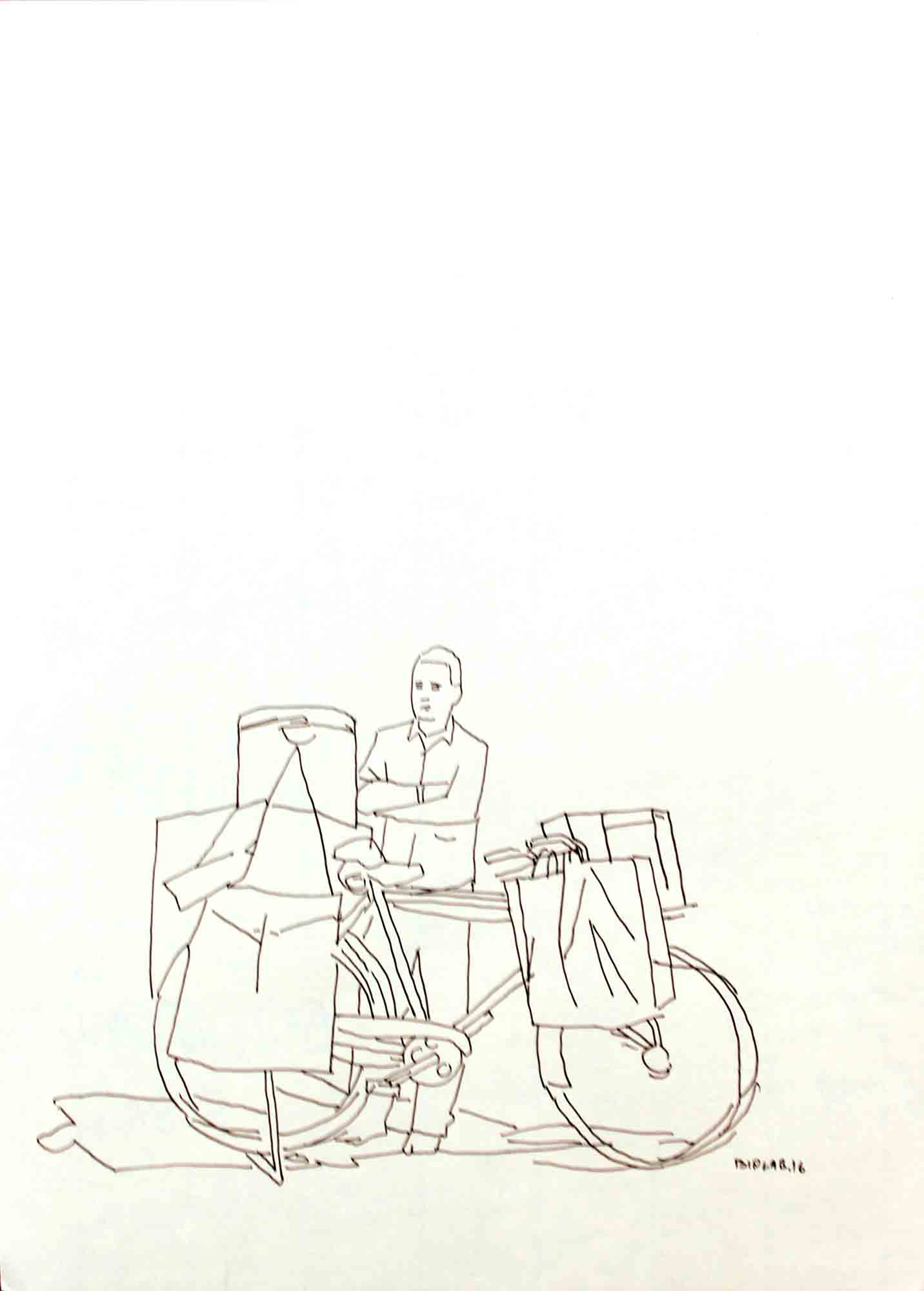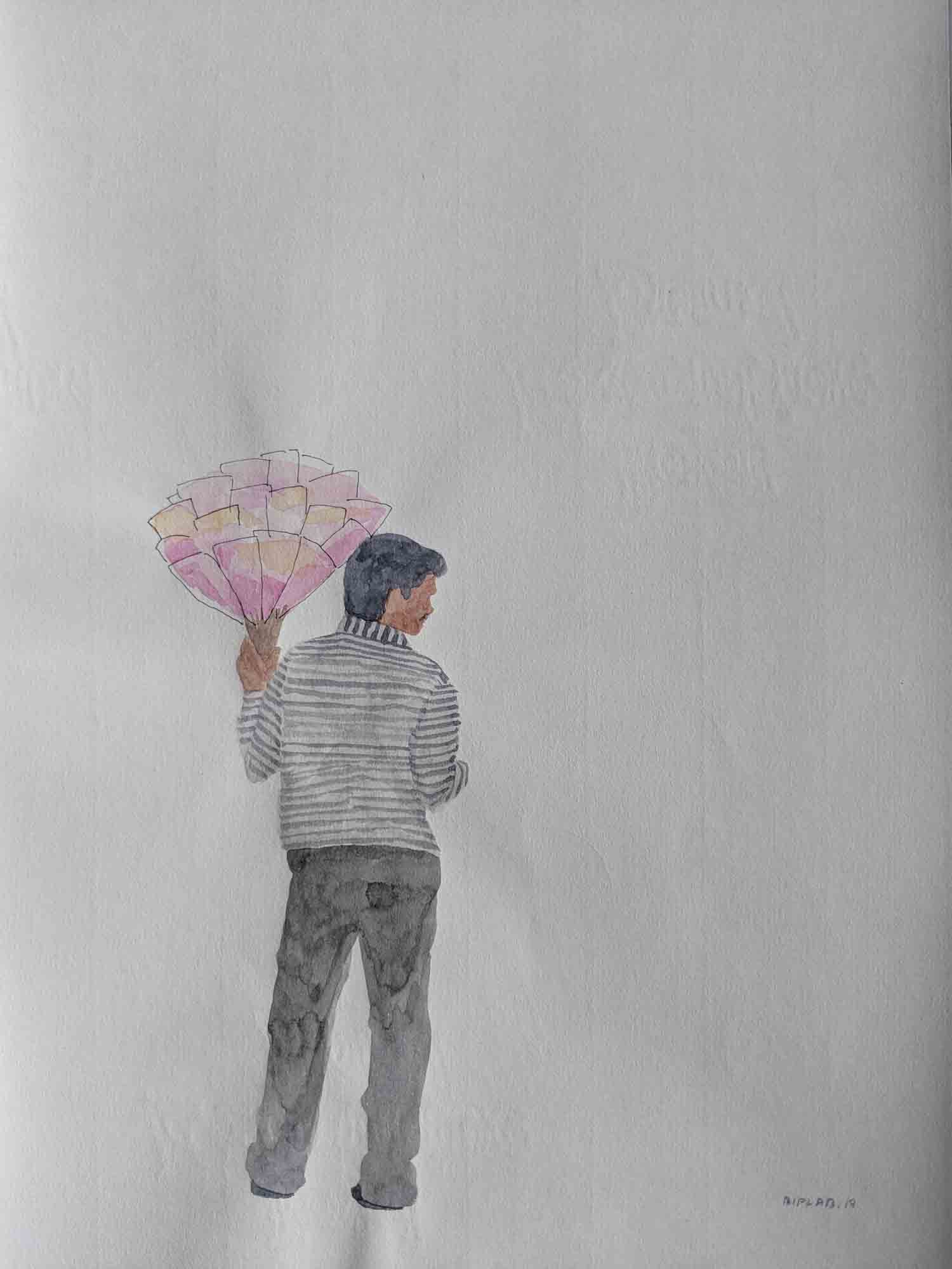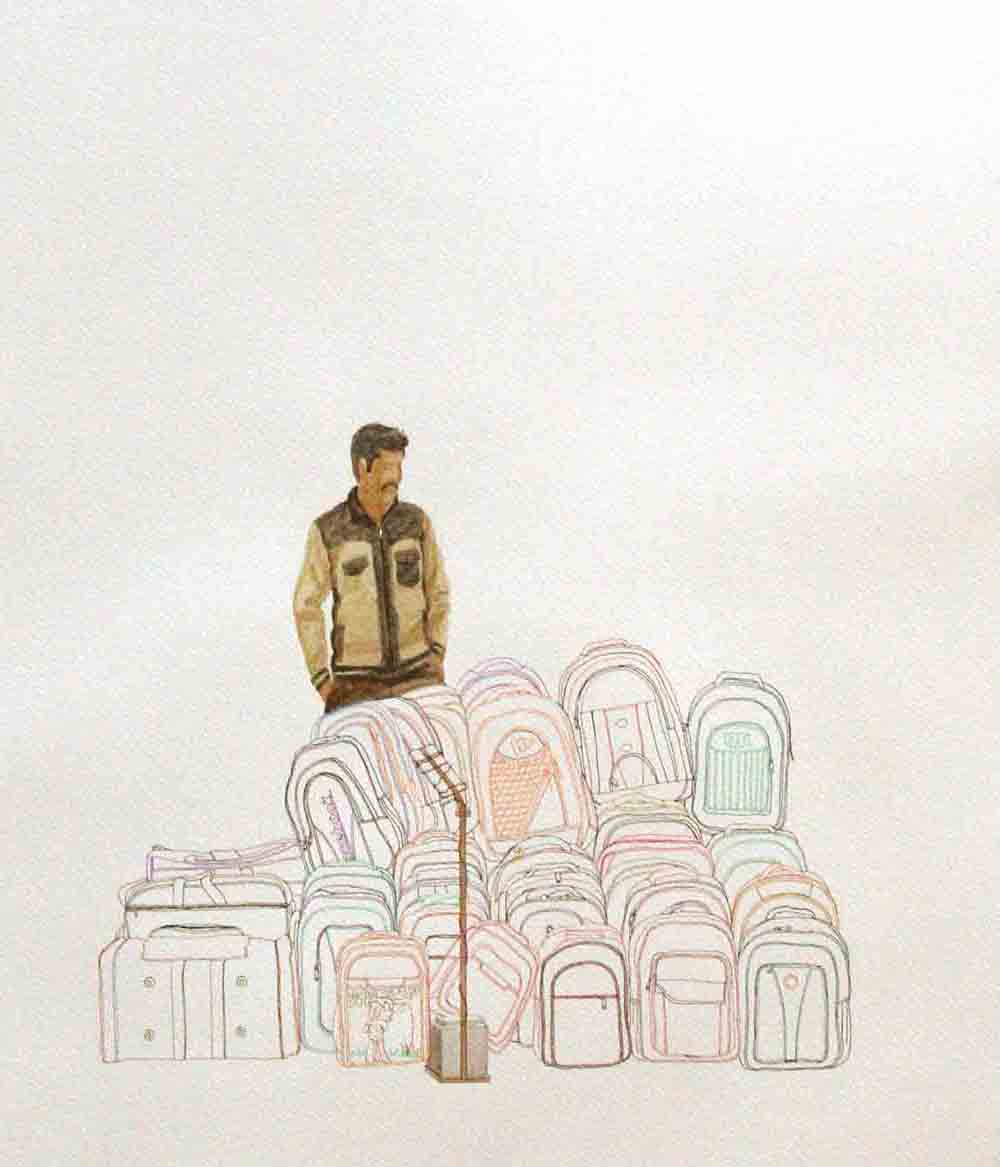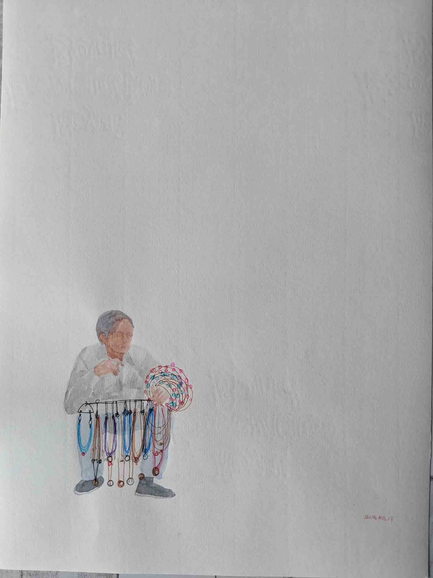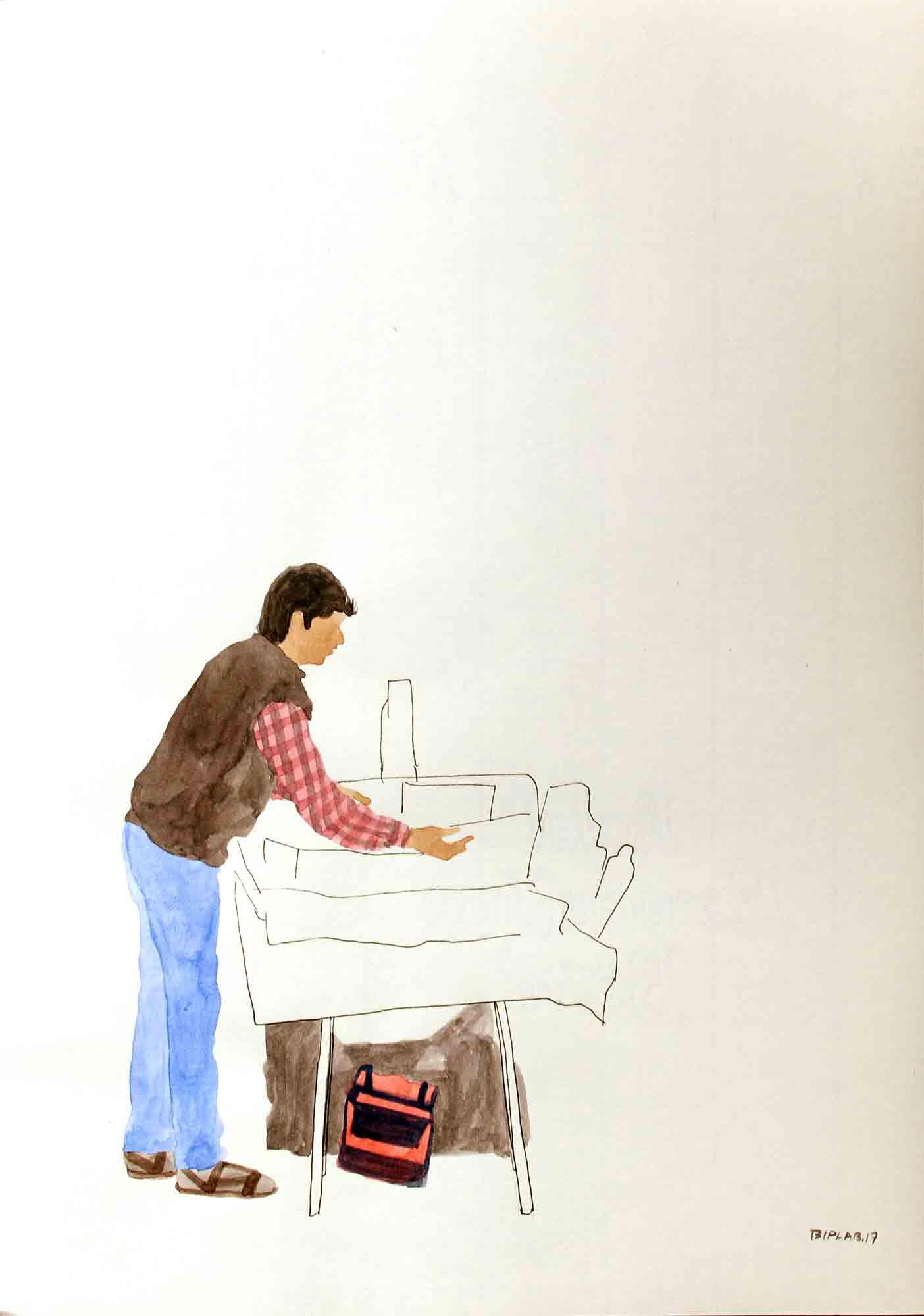 Sarkar's body of work narrates his extensive research on lifestyle and struggles of hawkers in their everyday life, and explores the relationship of body and object in an urban context. The miniaturist approach in his work underlines the simplicity and yet intricacy in his theme. The India Gate Series, in a simplistic form, portray the lifestyle of hawkers working at the India Gate. Sarkar is moved by the attitude of these hawkers who in spite of their difficult living, deal with their customers with great enthusiasm.