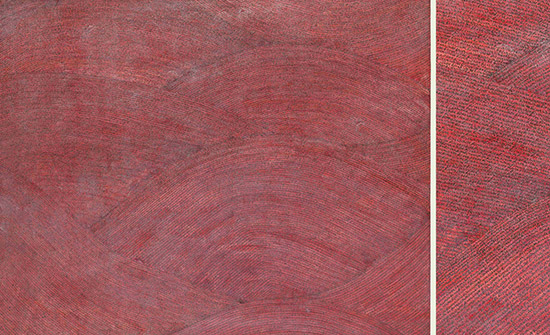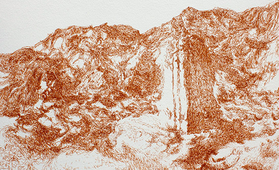 The works in this section utilise individual strokes to re-configure the matrix of traditional landscape paintings. Upon closer examination the mark making in these works resolve into unconventional constituent units – whether it is text, technological entrails, or anthropogenic refuse. Priyanka Govil’s landscapes highlight the complicity of the written word in denoting, shaping, and framing of landscapes. Landscapes understood as imaginary representations of places activated by the symbolic have deep entanglements with semiotics and language. Whether it is a sacred grove or a military encampment with restricted access, or a place with special literary, religious, or historical significance landscapes are inscribed with meaning, quite literally. By lacing her landforms with poetic utterances, Priyanka Govil renders visible these latent textual underpinnings of landscapes as well as their inherent performativity. In works such as The White River repetitions of the counterintuitive appelation to designate what could be a red desert with gently rolling dunes, seem like a ludicrous attempt to enforce a meaning that doesn’t fit, whereas in reality meanings and borders are assigned as arbitrarily and often. The work flouts the standard conventions of framing and composition such that the texture gives way to textuality while the form evokes viscerality. Puja Puri’s lightly scribbled landscapes seem delicately ephemeral like dandelions dehiscing at a touch and dispersing on the wind to deposit into other forms at other places.