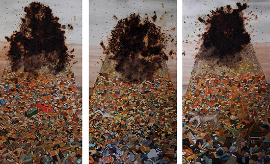The works in this section utilise individual strokes to re-configure the matrix of traditional landscape paintings. Upon closer examination the mark making in these works resolve into unconventional constituent units – whether it is text, technological entrails, or anthropogenic refuse. Priyanka Govil’s landscapes highlight the complicity of the written word in denoting, shaping, and framing of landscapes. Landscapes understood as imaginary representations of places activated by the symbolic have deep entanglements with semiotics and language. Whether it is a sacred grove or a military encampment with restricted access, or a place with special literary, religious, or historical significance landscapes are inscribed with meaning, quite literally. By lacing her landforms with poetic utterances, Priyanka Govil renders visible these latent textual underpinnings of landscapes as well as their inherent performativity. In works such as The White River repetitions of the counterintuitive appelation to designate what could be a red desert with gently rolling dunes, seem like a ludicrous attempt to enforce a meaning that doesn’t fit, whereas in reality meanings and borders are assigned as arbitrarily and often. The work flouts the standard conventions of framing and composition such that the texture gives way to textuality while the form evokes viscerality. Puja Puri’s lightly scribbled landscapes seem delicately ephemeral like dandelions dehiscing at a touch and dispersing on the wind to deposit into other forms at other places. By assuming this disintegrative quality, the works appear to unravel the fabric of eternity that composes landscape paintings. While closely studying the sites of certain ruinous temples and Gurudwaras in Pakistan, the artist deliberately chose to meld these ruins with their purlieu not only to emphasise the impermanence of landscapes, calling into question their naturalising function but also to highlight the luminous glory of land that doesn’t require any human markers for its embellishment. Sounak Das’ night-time photography on the streets of Dhaka, is an abject take on urban-scapes. The convoluted assemblage of cables, transformers, insulators and pylons remain largely unassimilated in our visual economy such that the average city-dweller looks right through them. By rendering visible this technological ontology that subtends the marvels of the cyber omniscience and electric omnipotence, the artist salvages this supporting paraphernalia from the margins of our vision, making it the central subject of reflection. In a similar vein, Ravi Chaurasiya alights his frame on the man-made topographies of abjection that are the rearing mounds of rubbish that have mushroomed around chief metropolitan centres, three such being in the suburbs of Delhi itself. The massive landfills provide a marker for modernity and its insatiable hunger for consumption. The scale and presence of these geographies of waste is so imposing that it makes sense to speak of them in terms of anthropogenic landscapes. By begging our attention to these man-made features, the artist calls upon us to take full stock of our actions that appear to carry out as if by an alien will, unmindful of ramifications.